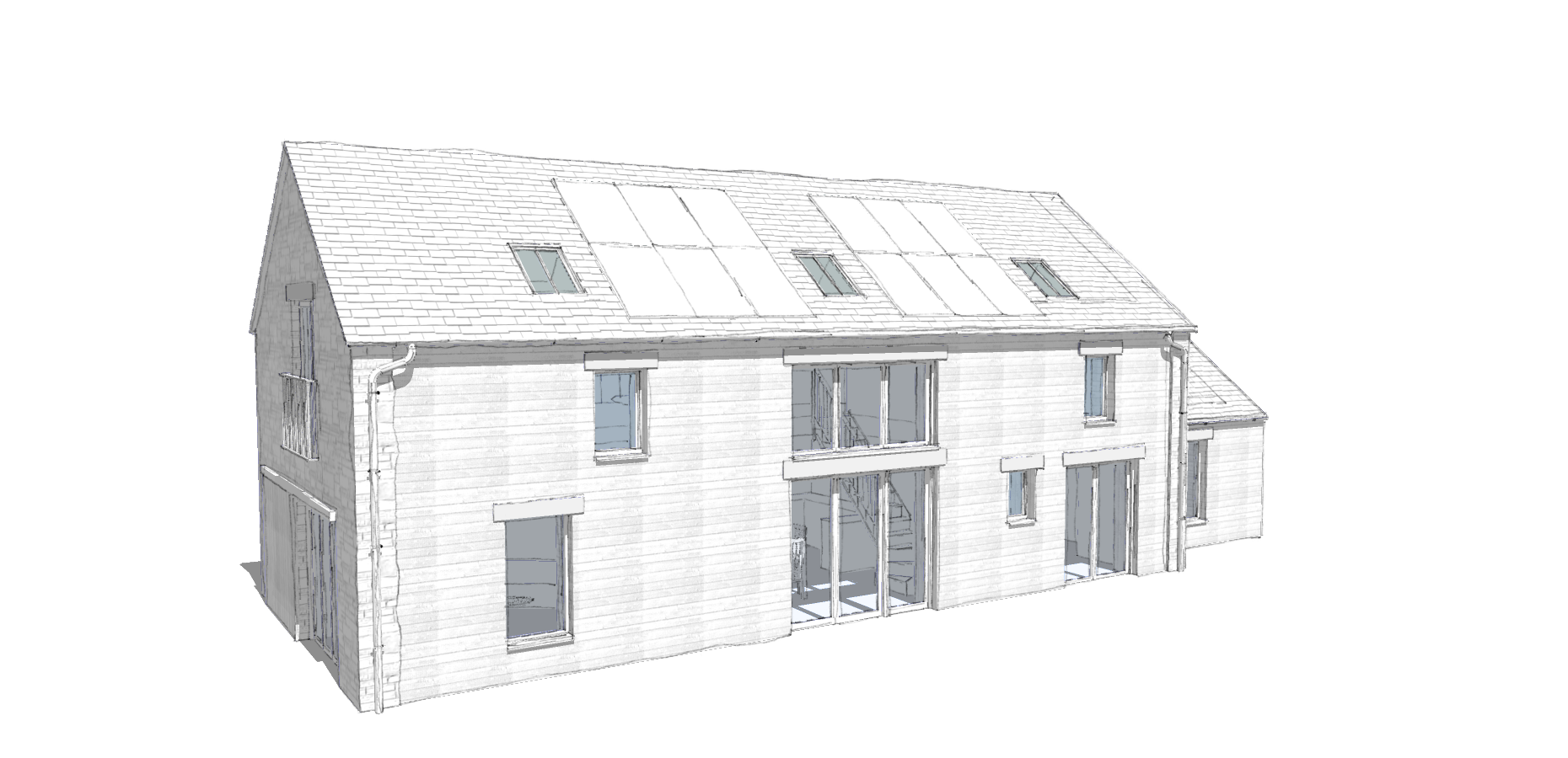 The large central glazed opening, combined with timber cladding emphasise the building’s barn-inspired character.