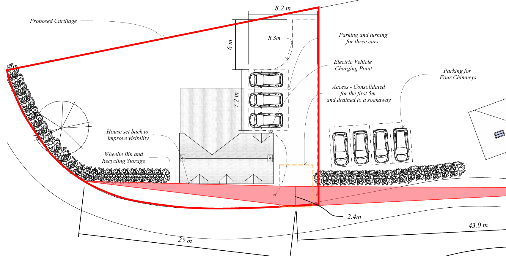 Key considerations such as domestic curtilage, on-site parking and turning space, and visibility splays are essential for both the proposed new dwelling and the existing house.